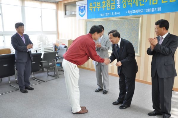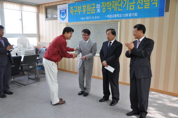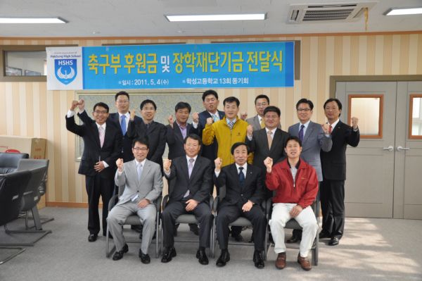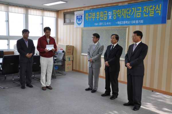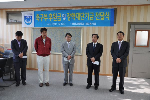 5월14일 본교총동문회사무실에서 13회동기회가 일일호프 수익금으로 축구부및 장학재단기금전달식을 가졌습니다