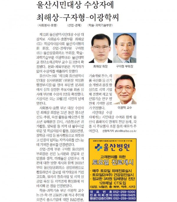 제12회 울산광역시 시민대상(사회 봉사 , 효행 부문) 수상자로