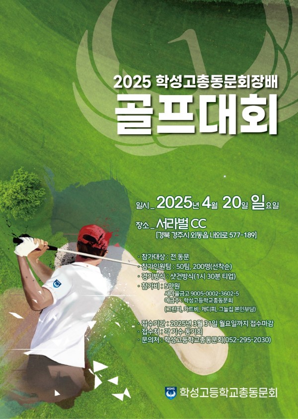 2025 학성고총동문회장배 골프대회 페이지 정보 작성자 사무국 작성일25-02-14 13:42 조회6,123회 댓글0건 관련링크 목록 본문 2025 학성고총동문회장배 골프대회일시 : 2025.04.20 (일)장소 : 서라벌cc접수처 : 각기수동기회 댓글목록 등록된 댓글이 없습니다. 목록
