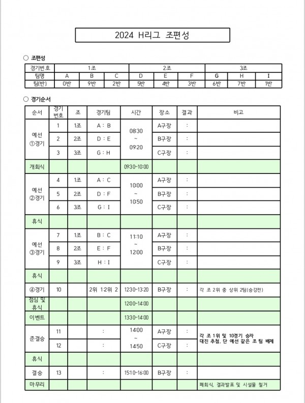 2024 H리그 행사 및 조편성(상세) 안내 페이지 정보 작성자 사무국 작성일24-09-11 15:14 조회2,033회 댓글0건 관련링크 목록 본문 2024 H리그 행사 및 조편성(상세) 안내우천시 행사 진행합니다 댓글목록 등록된 댓글이 없습니다. 목록