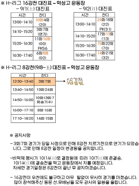 H-리그 16강전 결과 및 8강전 일정(시간변경)