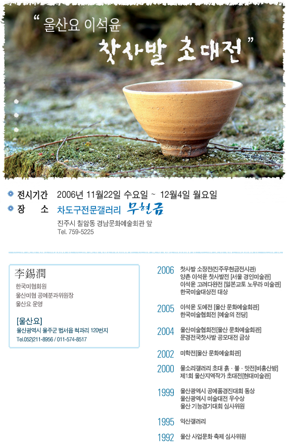 울산요 이석윤(2회) "찻사발 초대전" 페이지 정보 작성자 USN(18) 작성일06-11-22 14:41 조회6,979회 댓글0건 관련링크 목록 본문 댓글목록 등록된 댓글이 없습니다. 목록