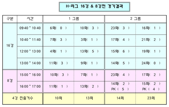 H-리그16/8강 경기 결과입니다.